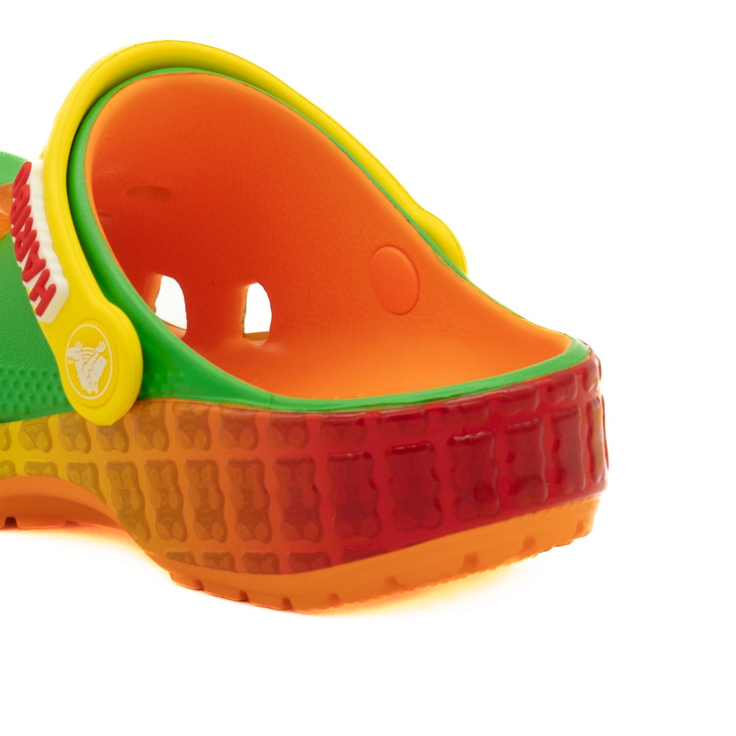 Cholewka: Jednoczęściowa pianka Croslite™ — lekka, wodoodporna i łatwa w czyszczeniu; perforacje zapewniają wentylację i pozwalają na personalizację przypinkami Jibbitz™ (motywy Haribo).
